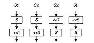- [math]\displaystyle{ \{ Ke_{3},Ke_{2},Ke_{1},Ke_{0} \} \leftarrow \{ Ke_{0}\lt \lt \lt 6, Ke_{3}\lt \lt \lt 6, Ke_{2}\lt \lt 16, Ke_{1}\lt \lt 24 \}; }[/math]