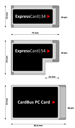 Стандартные карты имеют длину 75 мм и толщину 5 мм. Однако карты могут быть толще в той части, которая не вставляется в сам слот. В 34-мм слоты можно вставить только 34-мм карту, а в 54-мм слот можно вставить как 54-мм карту, так и 34-мм. Для этого в задней части слота сделана диагональная направляющая.