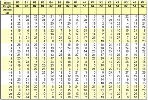 Диффузионные сети для раундовой функции К показаны в таблице. Следует заметить, что ни в одной диффузионной сети для этой функции нет дополнительных входов. В половине диффузионных компонент функции B присутствуют дополнительные входы, в которые поступают биты из регистра Ky раундовой функции K.