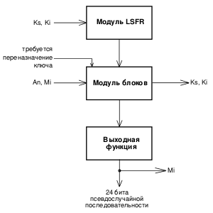 Однобитовый выходной поток функции смешения — это единственные данные, получаемые из работы модуля LSFR. Этот поток снабжает модуль блоков материалом для создания ключей, если поступил сигнал на переопределение ключа.