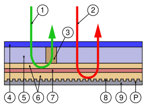 Запись на диск в виде голограммы осуществляется двумя лазерными лучами: красным и зелёным, сведёнными в один параллельный луч. Зелёный лазер читает данные, закодированные в виде сетки с голографического слоя, близкого к поверхности диска, в то время как красный лазер используется для чтения вспомогательных сигналов с обычного компакт-дискового слоя в глубине диска. Вспомогательная информация используется для отслеживания позиции чтения наподобие системы CHS в обычном жёстком диске. На CD или DVD эта информация внедрена в данные.