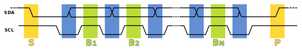 Таким образом, передача 8 бит данных от передатчика к приёмнику завершаются дополнительным циклом (формированием 9-го тактового импульса линии SCL), при котором приёмник выставляет низкий уровень сигнала на линии SDA, как признак успешного приёма байта.