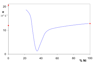 - 33НК (англ. Inovco) (Ni — 33 %, Co — 4,5 %, Fe — остальное) в отожженном состоянии имеет ТКЛР α не более 1,5⋅10−6/°C (в диапазоне −60…+100 °C). Особо чистые сплавы имеют ТКЛР до 0,55⋅10−6/°C (в диапазоне +20…+100 °C)[1];