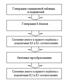 Алгоритм состоит из генерации подключей и стандартной таблицы замен. На основе стандартной таблицы замен строятся S-блоки для каждого октета преобразований.