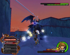 Бои в Kingdom Hearts II происходят в реальном времени. Игрок использует аналоговый стик и кнопки, чтобы бегать и прыгать; также в левом нижнем углу экрана находится меню, в котором можно выбрать команду (англ. Commands) — то или иное действие персонажа. С помощью меню можно атаковать врага, применить заклинание, использовать предмет, призвать нового напарника на поле боя или использовать совместную атаку с напарником[10]. Появилась новая способность «Команда реакции» (англ. Reaction Command), которую можно применить только в битвах против определённых врагов. Чтобы её использовать, игрок должен нажать кнопку