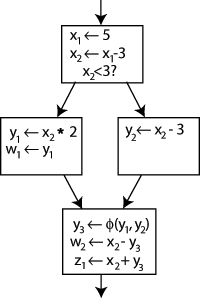 Пока остаётся неясным, какое значение y будет использоваться в нижнем блоке. Там имя y может означать как y1, так и y2. Для того, чтобы разрешить неоднозначности такого рода, в SSA введена специальная Φ-функция. Эта функция создаёт новую версию переменной y, которой будет присвоено значение либо из y1, либо из y2, в зависимости от того, из какой ветви перешло управление.
