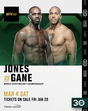 UFC 285: Jones vs. Gane — турнир по смешанным единоборствам, организованный Ultimate Fighting Championship, который был проведён 4 марта 2023 года на спортивной арене «T-Mobile Arena» в городе Лас-Вегас, штат Невада, США.[1]