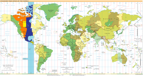 оранжевым — зона UTC−6 летом (апрель-октябрь) в Северном полушарии и зона UTC−6 зимой (апрель-октябрь) в Южном полушарии